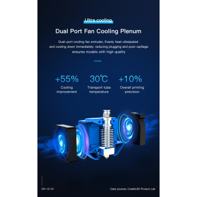 The dual cooling fans of the Creality CR-10 v3 significantly improved the material supply. Thanks to the cooling, the material intake improves considerably. The two coolers significantly optimize cooling by 55%. This allows low temperatures of 30 ° C during filament transport. This improves the printing precision by 10%.