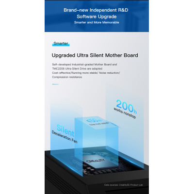 The TMC2208 motherboard works quietly and consistently reliable. 3D prints lasting up to 200 hours are possible. The noise level is below 50 dB.